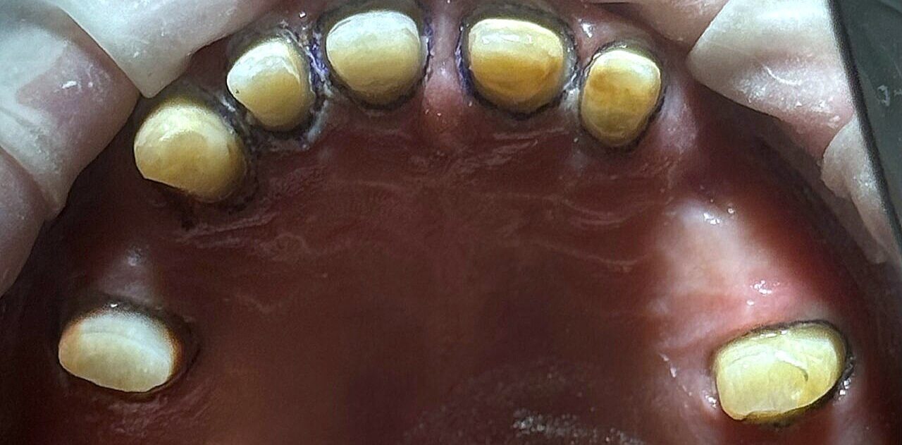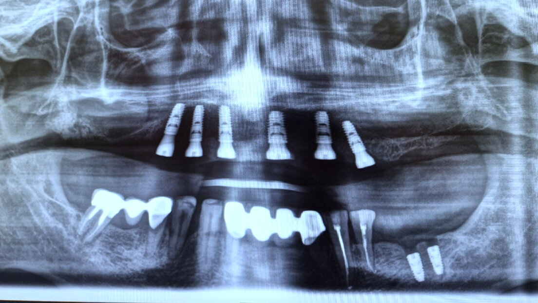 Після детального обстеження та консультації було прийнято рішення провести протезування за методикою "все на шість" на верхній щелепі. Ця технологія передбачає встановлення шести імплантатів, на яких фіксується незнімний протез. Це дозволяє відновити повну функціональність та естетику зубного ряду. На цей час пацієнт перебуває на етапі підготовки до імплантації.