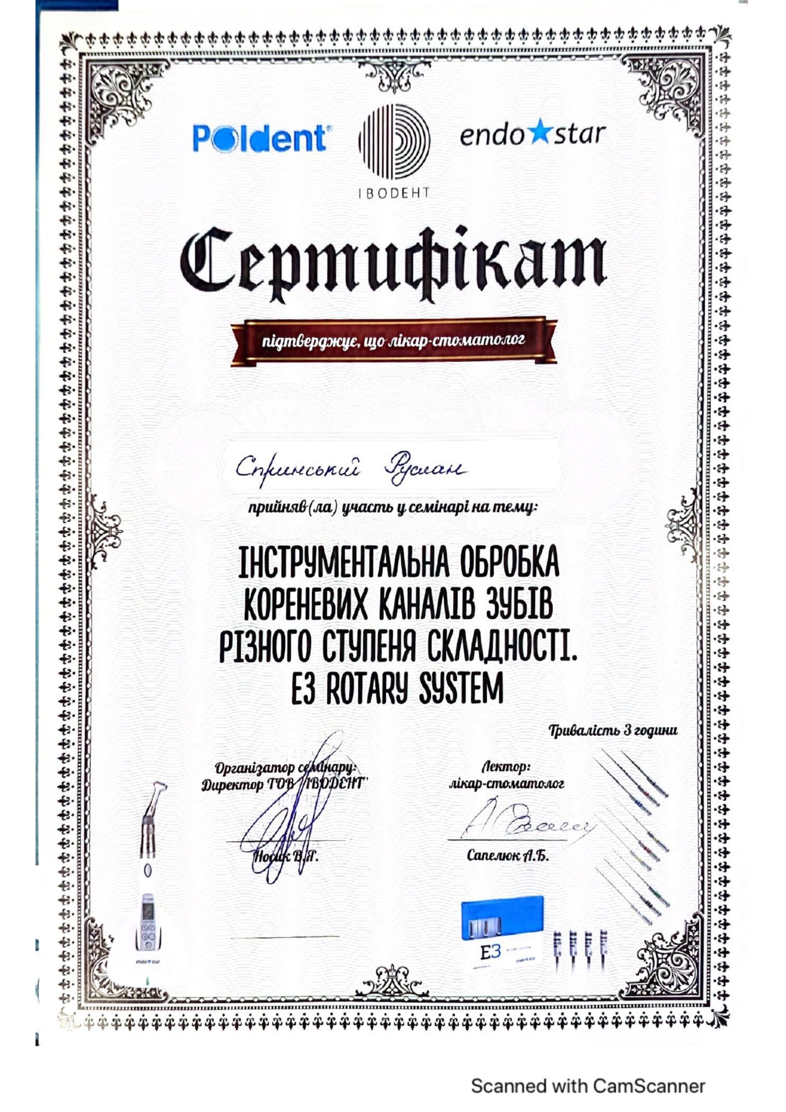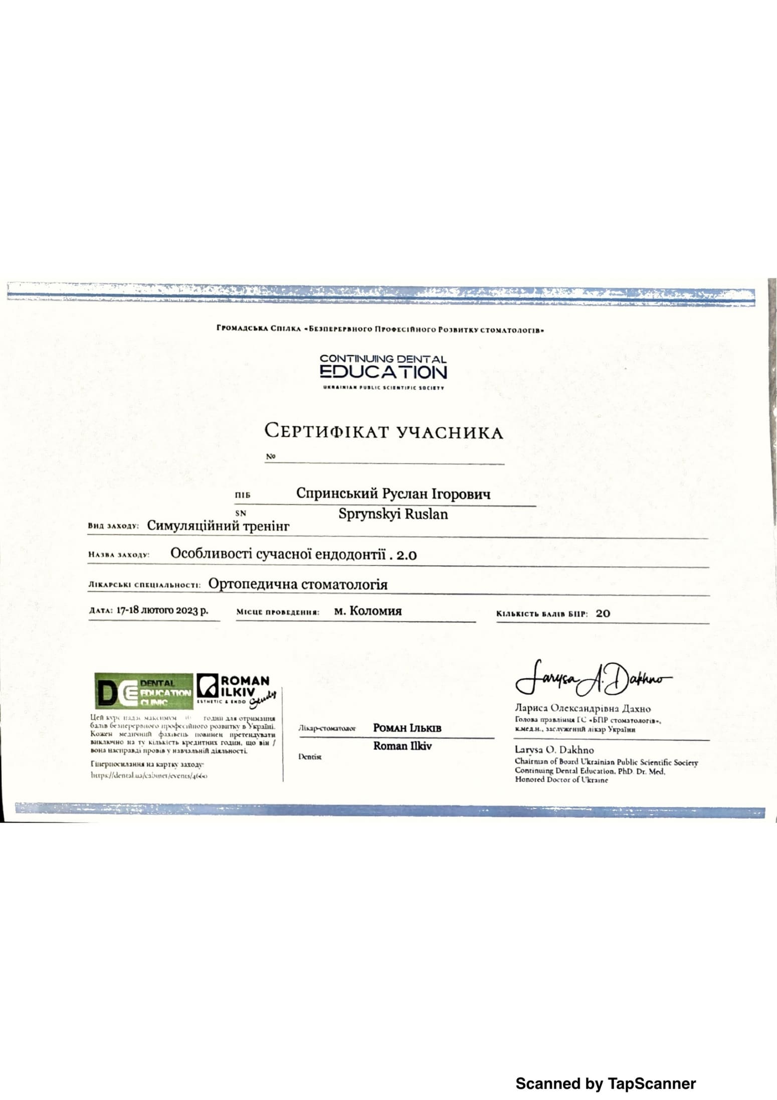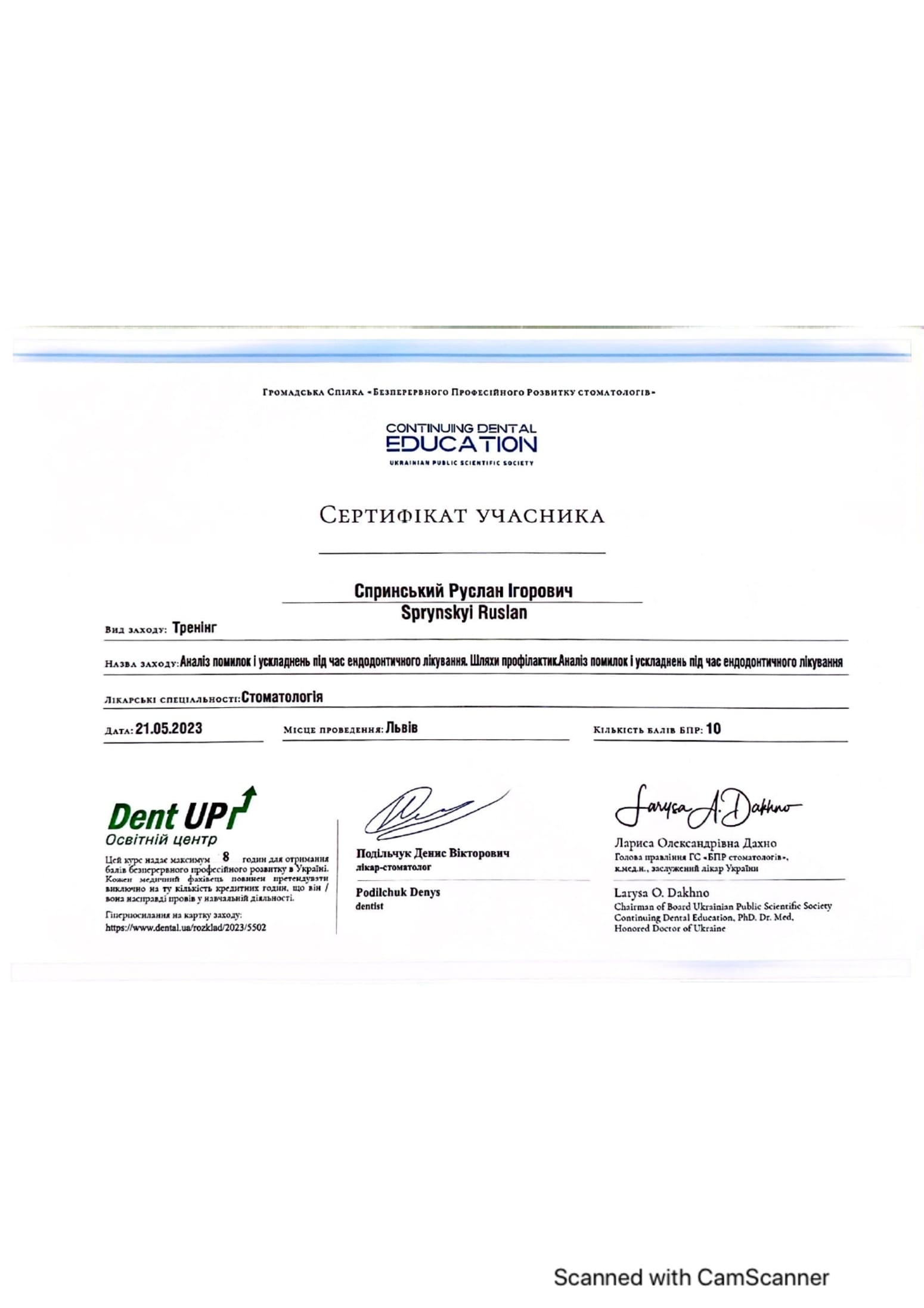 2. Тренінг «Аналіз помилок і ускладнень ендодонтичного лікування. Шляхи профілактик.» Денис Подільчук 21.05.2023 р. 10 балів БПР.