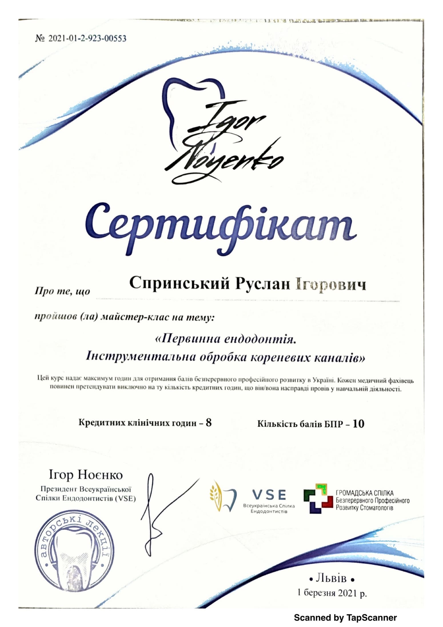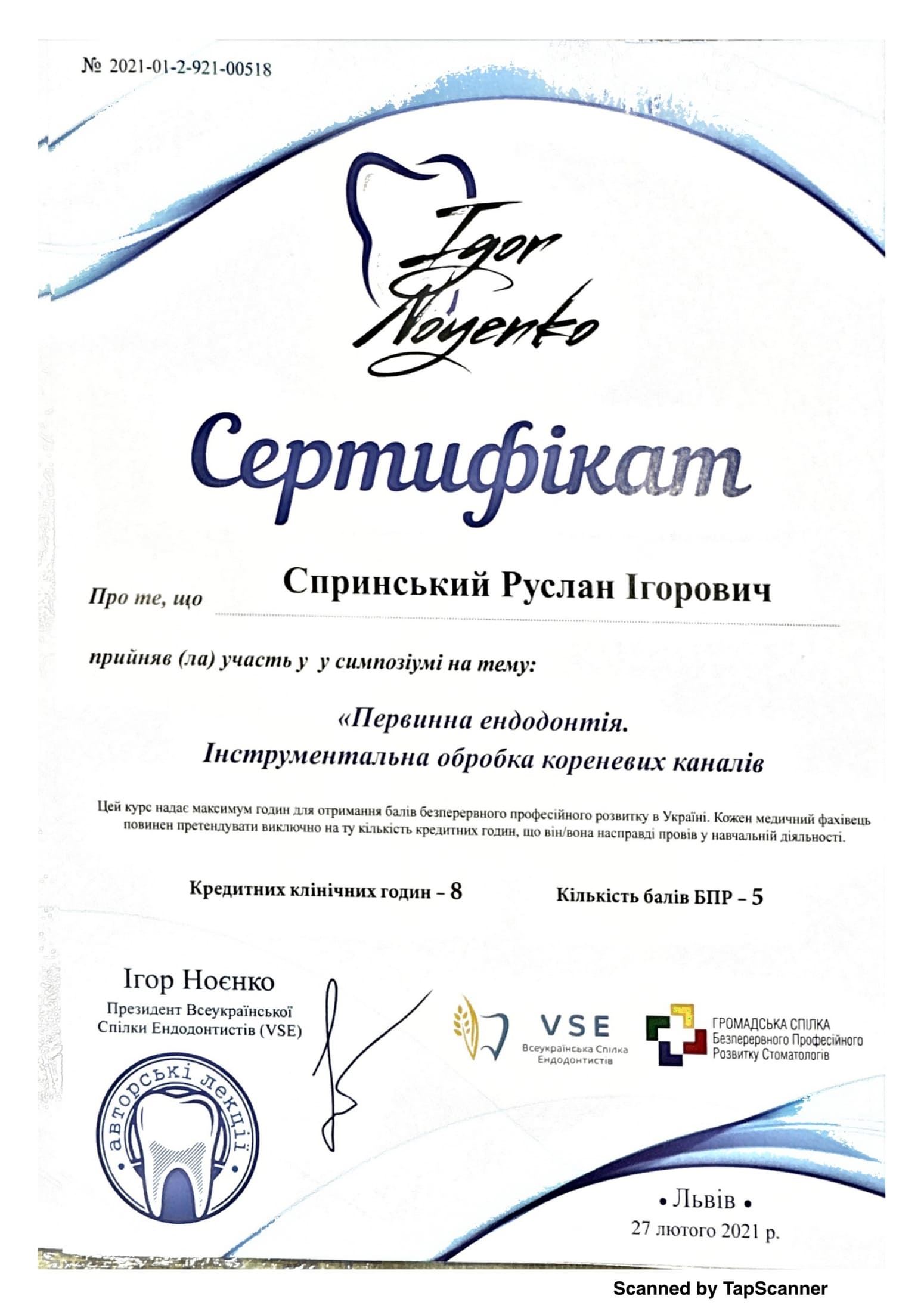 3. Симпозіум на тему «Первинна ендодонтія. Інструментальна обробка кореневих каналів» Ігор Ноєнко 27.02.2021 р. 5 балів БПР.